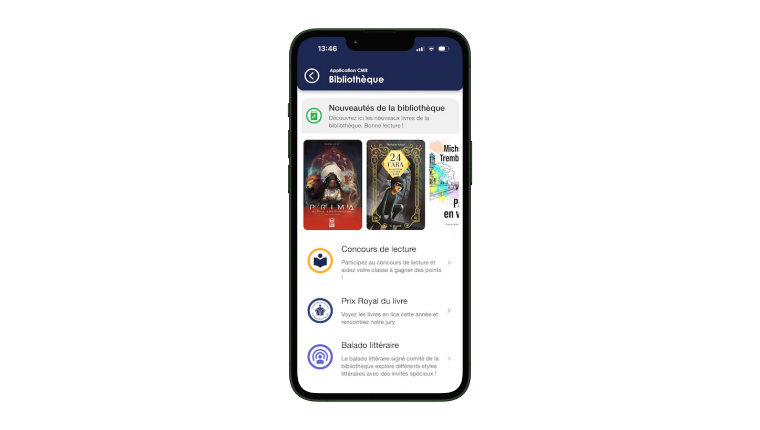 Notre dernier ajout c’est le Babillard, avec défilement des affiches que l’on retrouve aussi sur les babillards physiques du collège, ce qui nous permet de sauver sur les quantités à imprimer pour l’annonce d’activités culturelles, sportives, pédagogiques… Il y a aussi un babillard électronique pour les nouveautés à la bibliothèque.