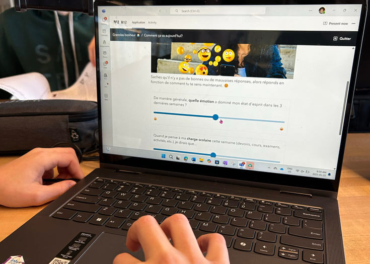 Un sondage est envoyé aux élèves aux trois semaines pour mesurer leur engagement envers l’école, leur bien-être et leur humeur. Catherine et Andrea peuvent alors obtenir des données et analyser la rétroaction des élèves, ce qu’ils rapportent de leur interaction avec la plateforme, et faire des interventions. L’objectif à long terme est de suivre l’état de bien-être des élèves afin d’identifier des moments où ils pourraient bénéficier d’un soutien supplémentaire.
